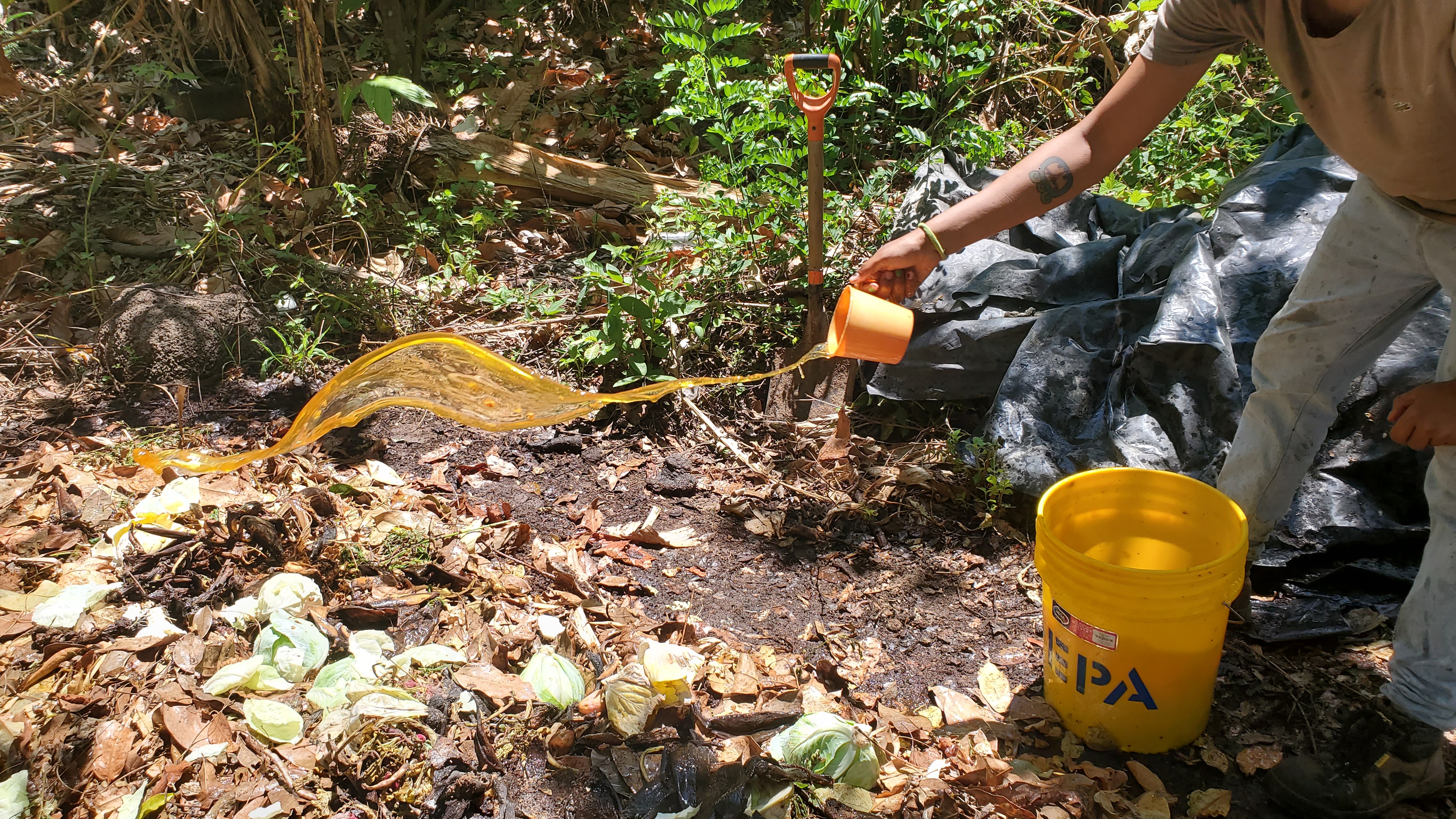 Durante el proceso, Mauricio incorpora un líquido amarillo de olor dulce que llama la atención. Es un acelerador microbiano hecho con fruta madura: guineo majoncho y, ahora que empieza la temporada, también mango.